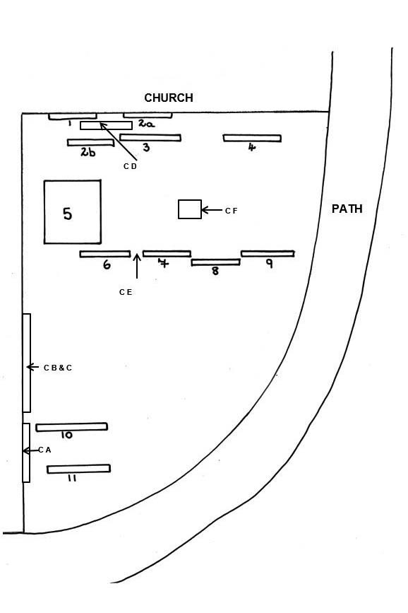 Section F Section plan List of graves Grave notes Photographs Section G Section plan List of graves Grave notes Photographs Section H Section plan List of graves Grave notes Photographs Kerbs Sections plan List of kerbs Kerb notes Photographs Miscellany Sections plan List of miscellany Miscellany notes Photographs Inscriptions Some notes on the inscriptions Inscriptions of note